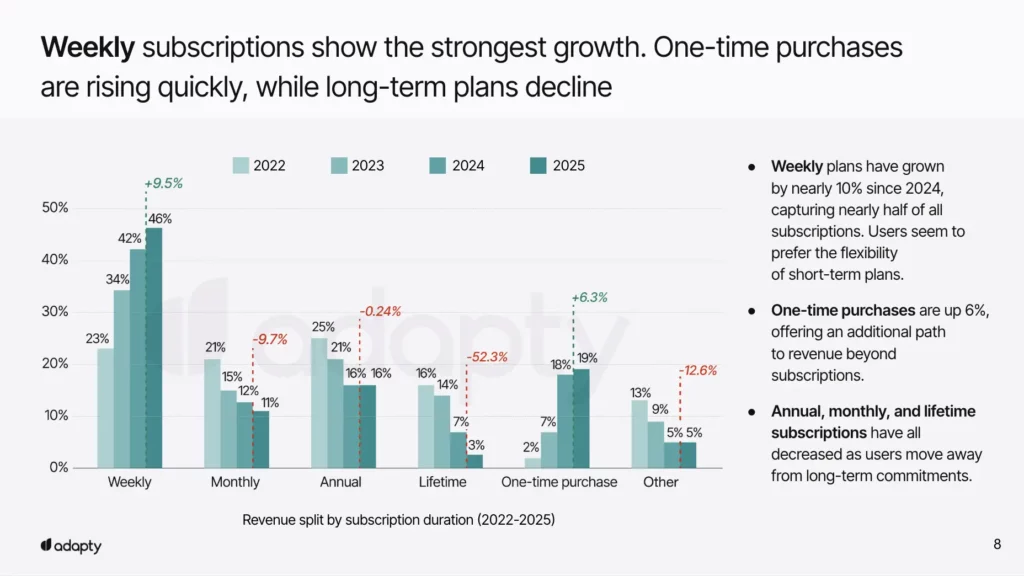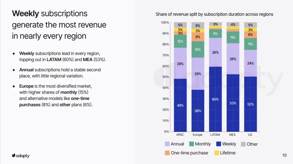 Weekly subscriptions have fundamentally changed the game. By capturing 47% of total revenue, they’ve proven that low commitment beats low prices.