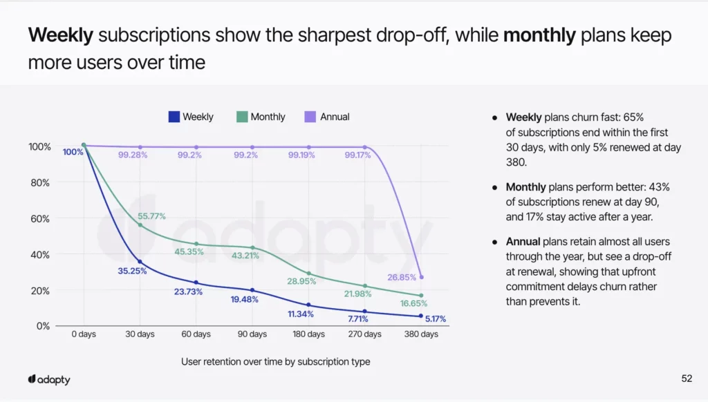 Weekly plans have a retention problem: 65% churn by day 30. However, this becomes an advantage when you design for strategic upselling.