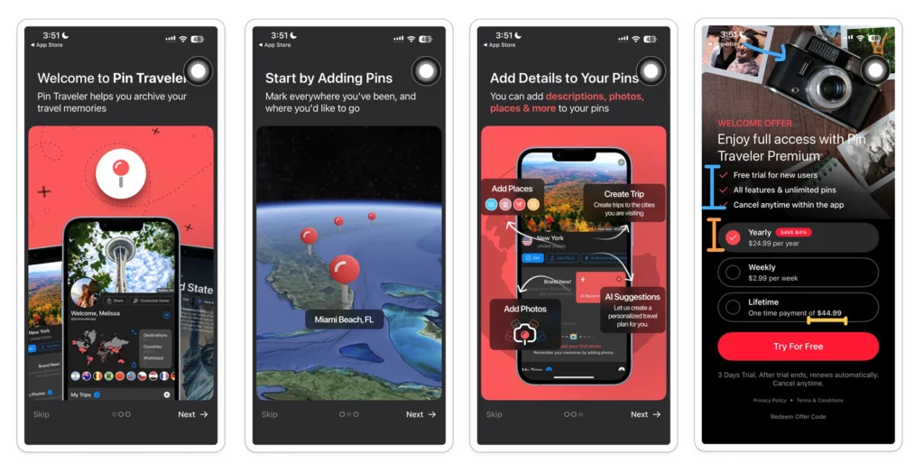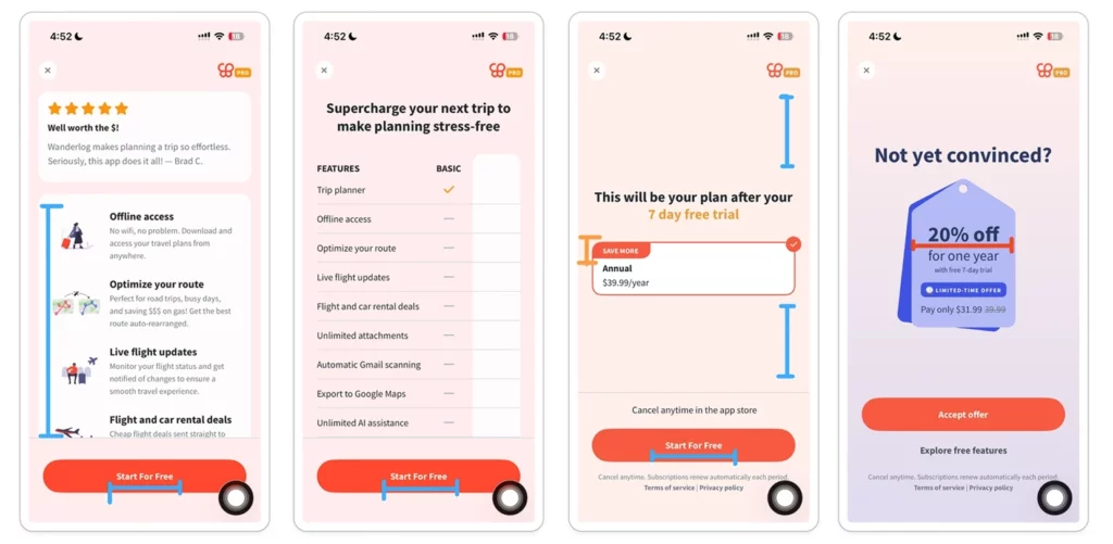 - Wanderlog uses a multi-page paywall to present “pro features + benefits” in concise, digestible segments.