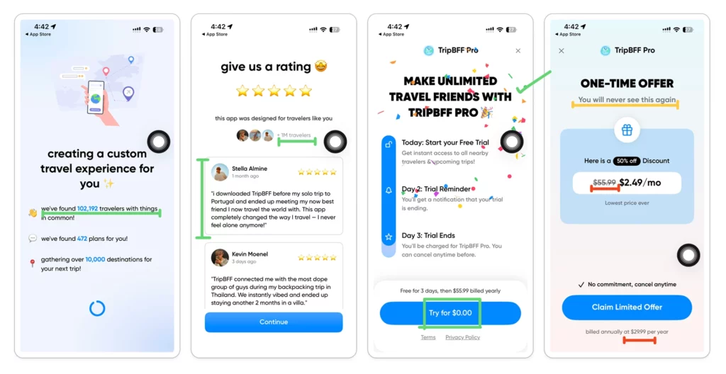 - CTA button copies like “Try 7 days for free” or “Unlock lifetime budgeting” might perform better compared to more direct ‘Subscribe now’ and ‘Buy now’.