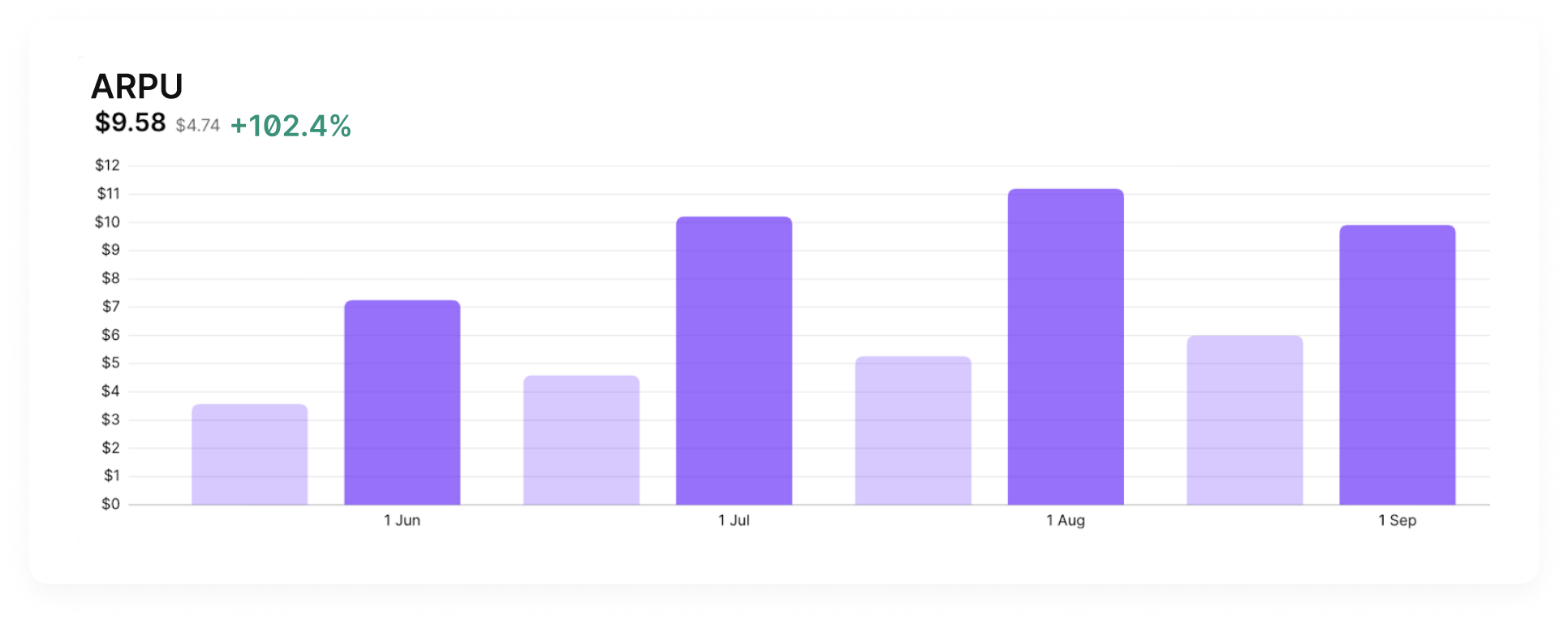 Shortly after partnering with Adapty, the app increased its conversion rate to purchase by 30% just by updating the onboarding flow. A series of A/B tests and pricing tweaks resulted in 102% ARPU and 50% total revenue growth over four months.