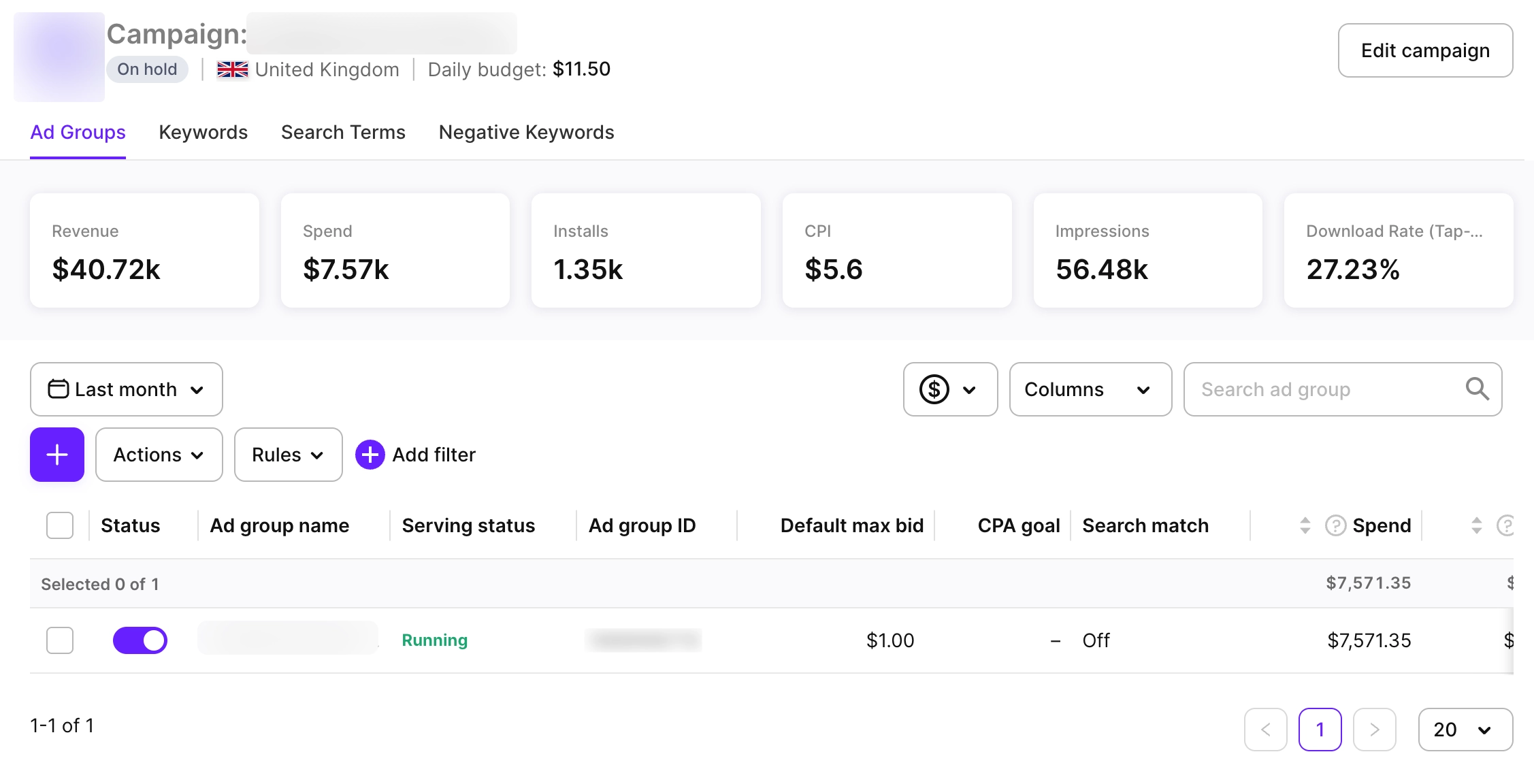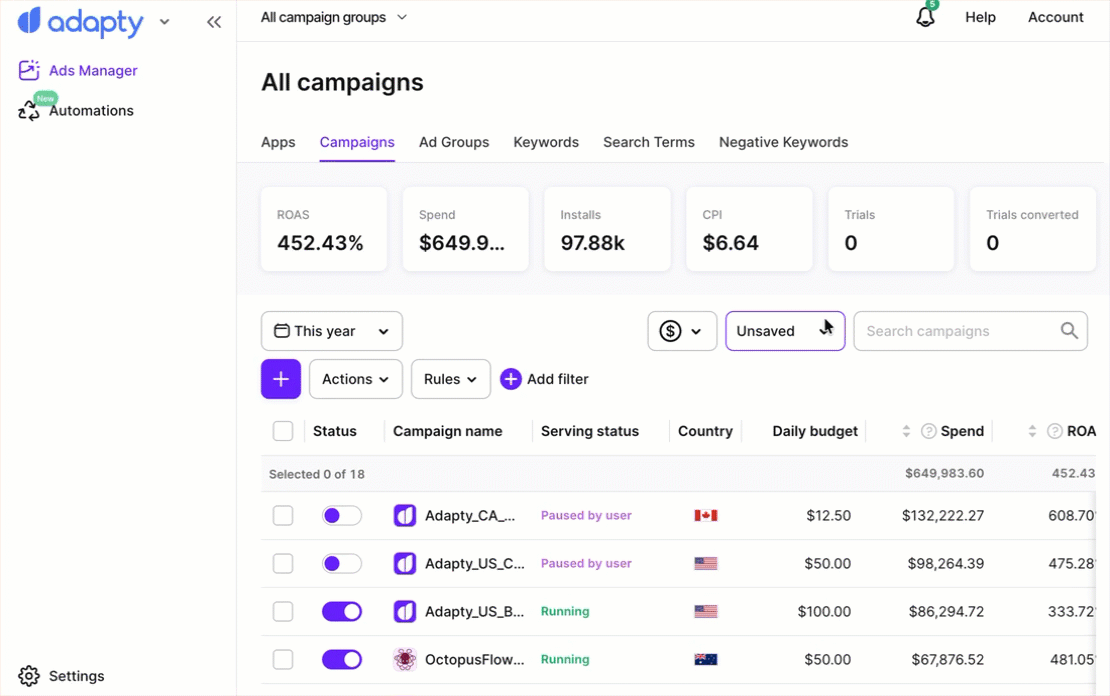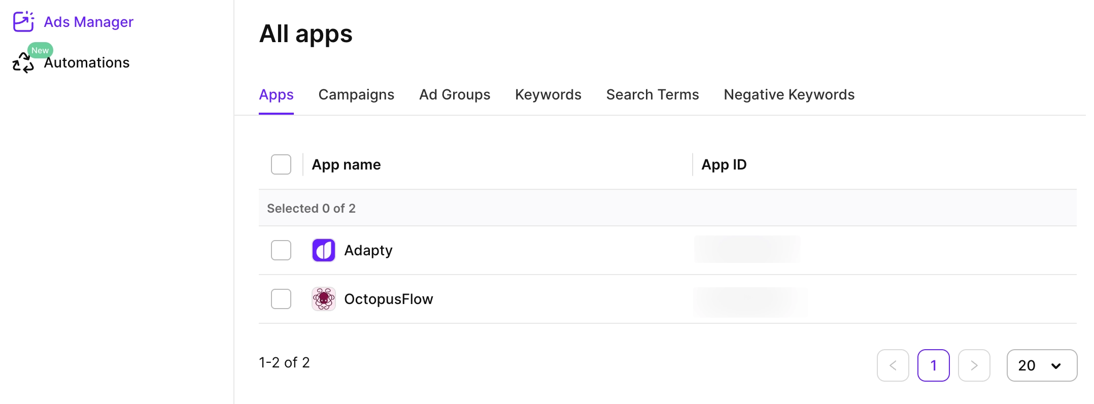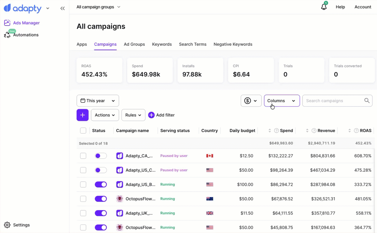 Ads Manager is a section of the Adapty Ads Manager dashboard that lets you see all key metrics in one place and organize them by apps, campaigns, ad groups, keywords, and search terms. You can customize which metrics you see and view data for all your campaigns at once.