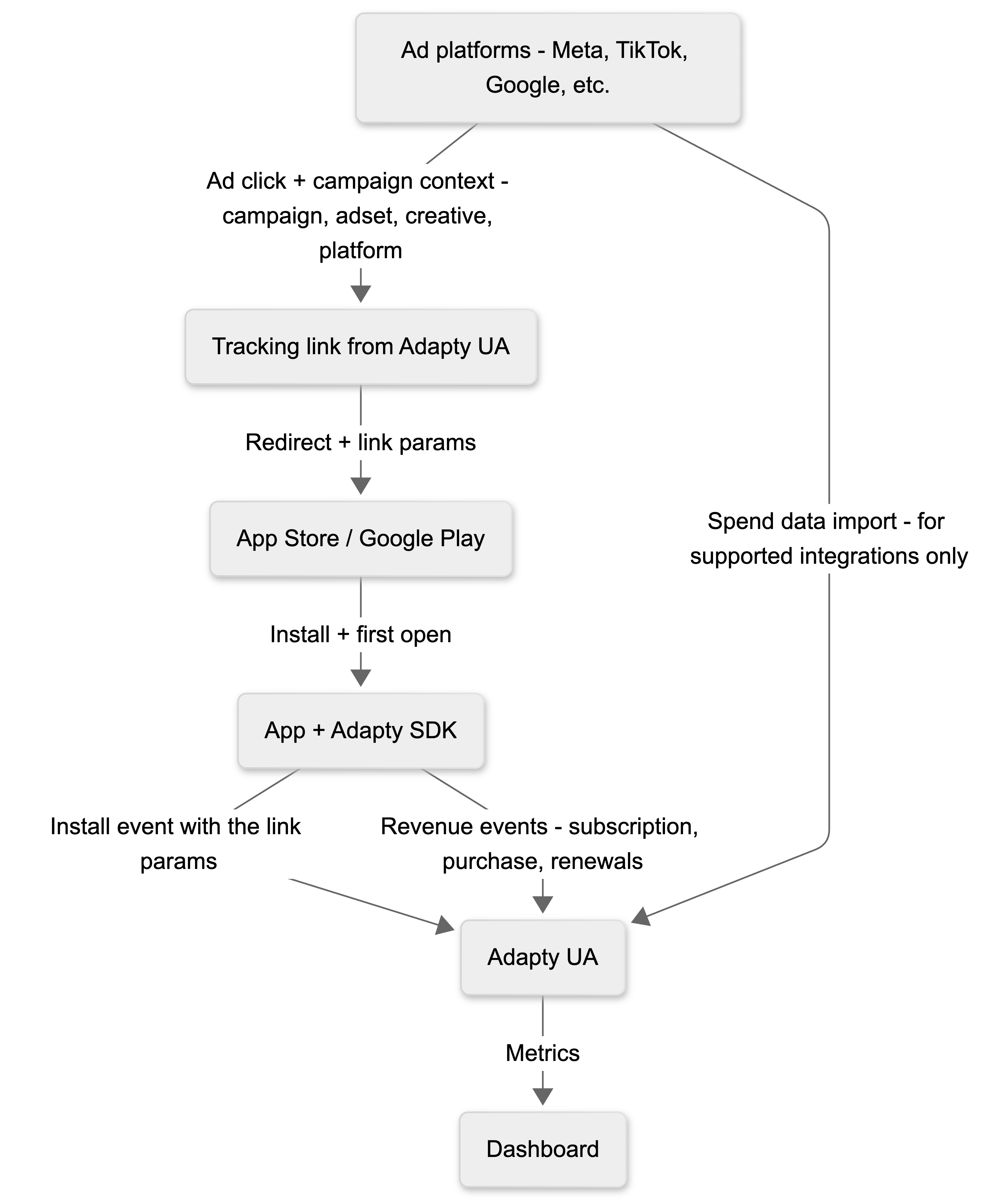 Adapty User Acquisition attributes app installs and subscription revenue to ad campaigns by combining data from ad platforms, tracking links, and your app.