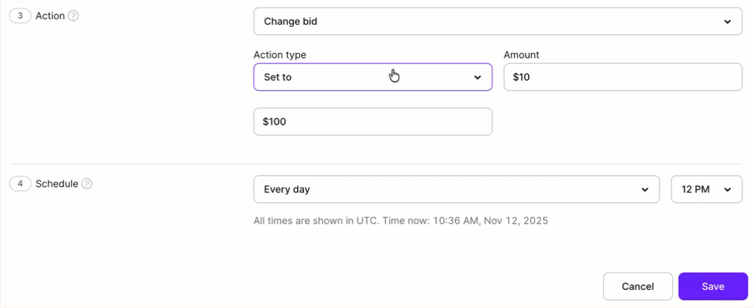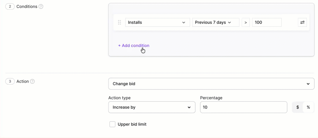 - Optionally, toggle and enter Upper bid limit to set a maximum bid cap. Use Upper bid limit as a safety guard to avoid accidentally overbidding if the rule runs many times in a row.