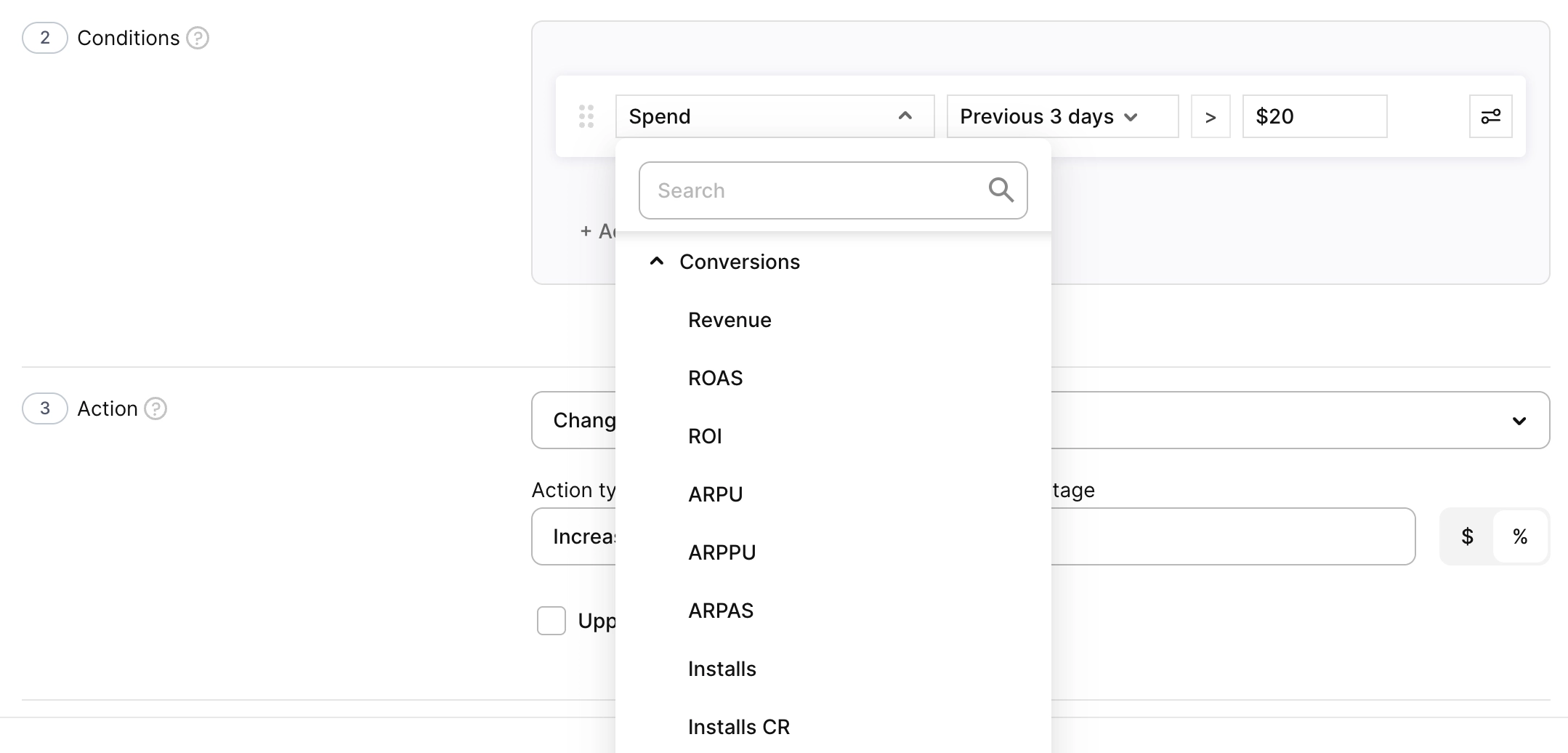 - Combine spend + conversions. Avoid rules based on a single metric; use Spend + Installs/Trials/ROAS together.