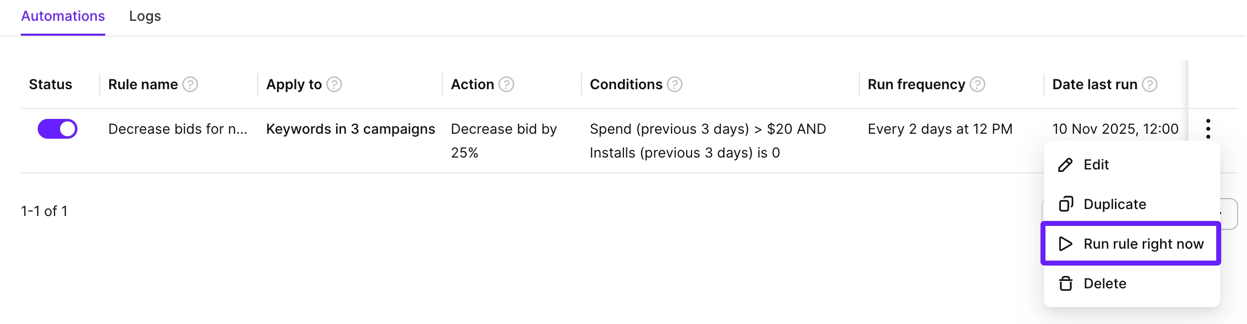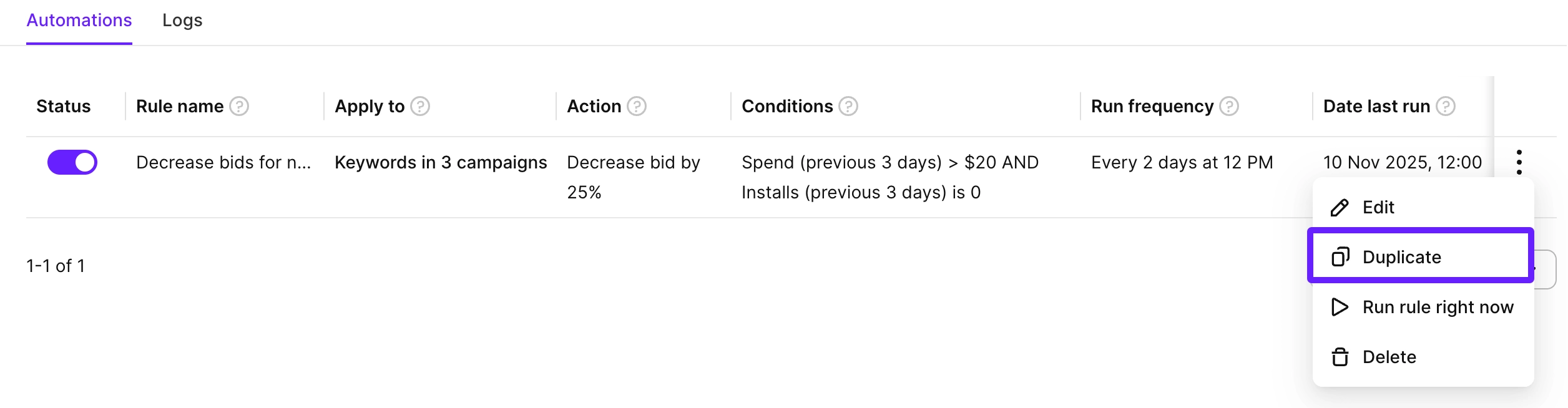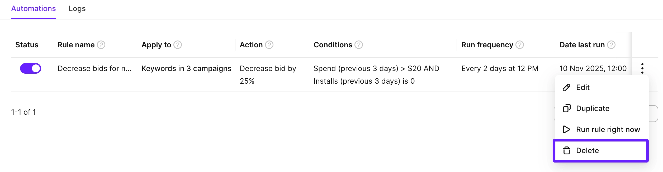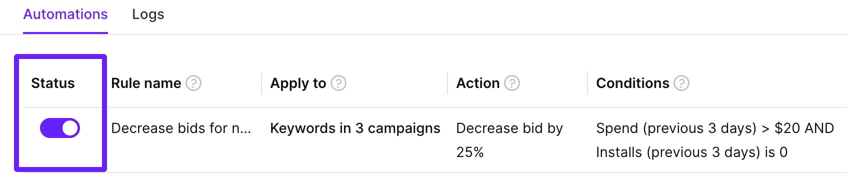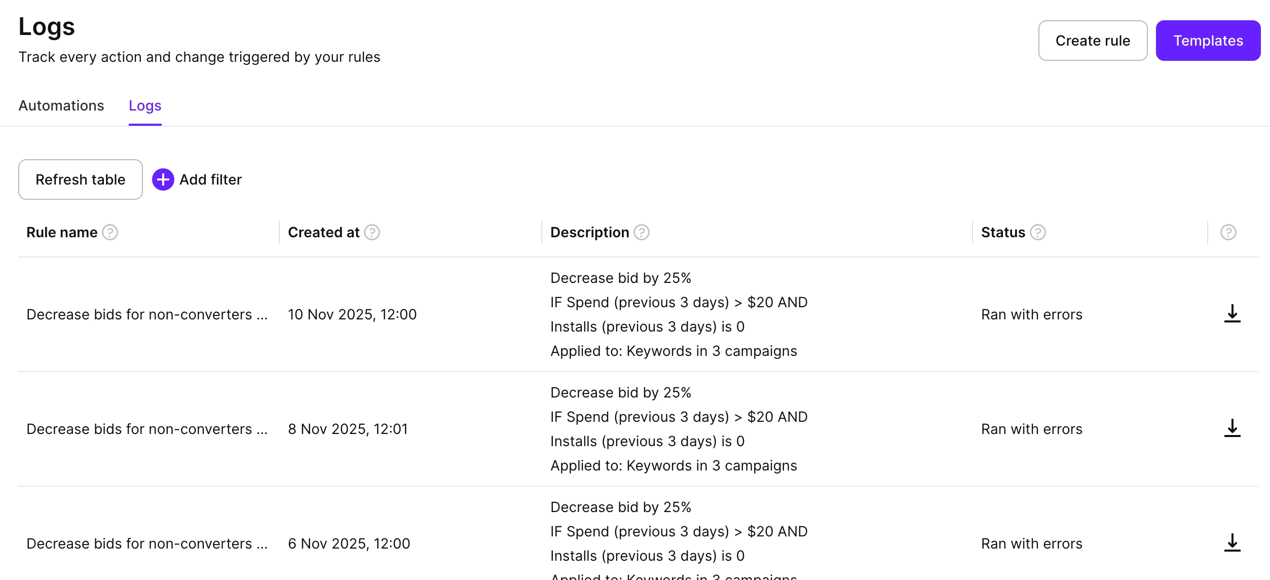 - Description: Summary of the action taken, conditions applied, and targets (e.g., "Decrease bid by 25%, IF Spend (previous 3 days) > $20 AND Installs (previous 3 days) is 0, Applied to: Keywords in 3 campaigns")
