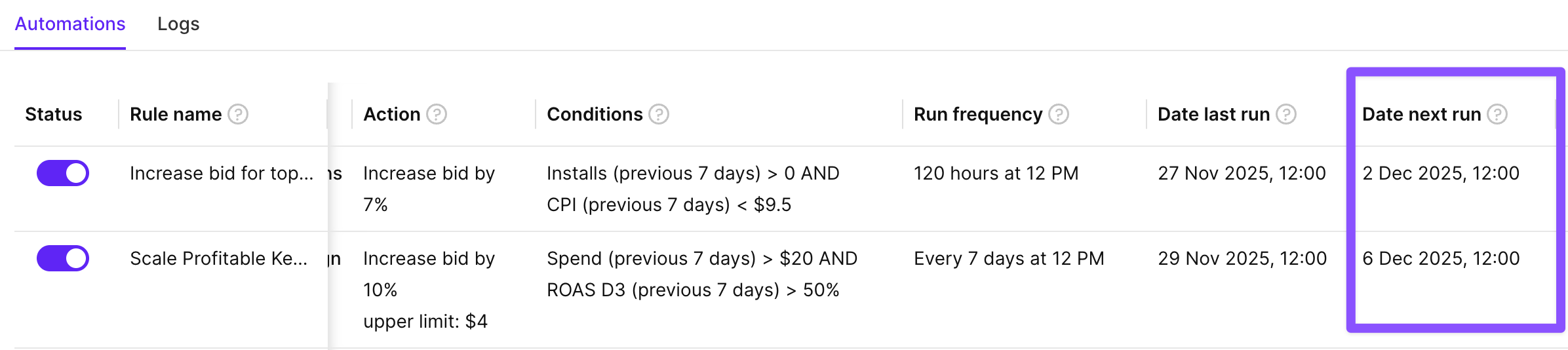 You can also track rule execution timing in the Automations tab using the Date last run and Date next run columns, which show when each rule last executed and when it's scheduled to run next.