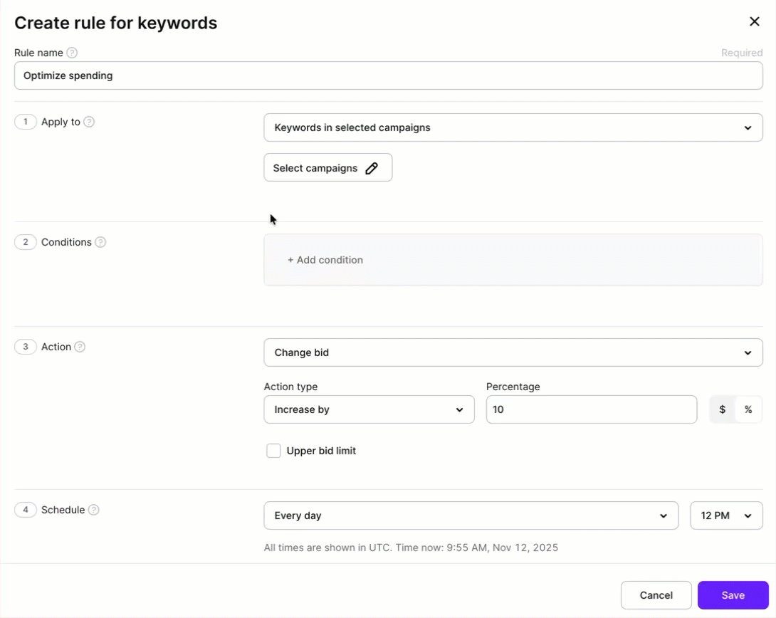 Rules change only bids. They don’t pause campaigns, edit budgets or keywords.