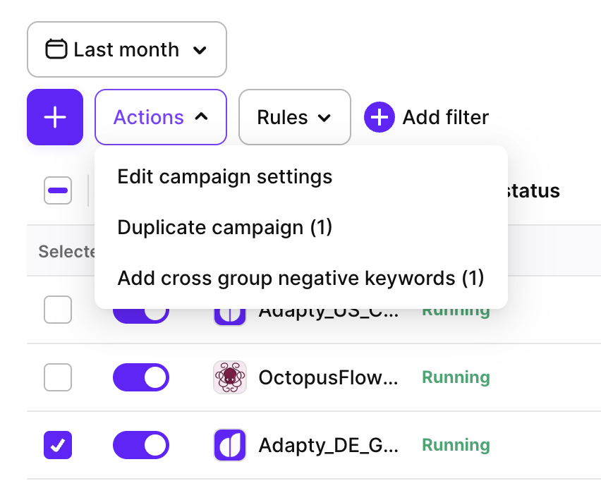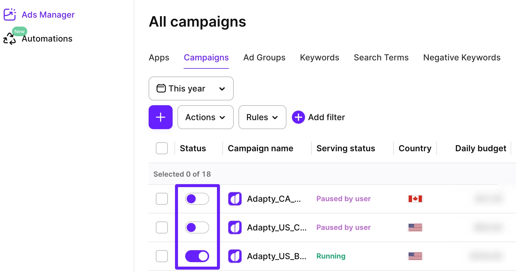 Apple Ads Manager has a two-way integration with Apple Ads: you get near real-time performance data, and you can create and edit campaigns directly from the Adapty dashboard in a much more convenient way than in the native UI.