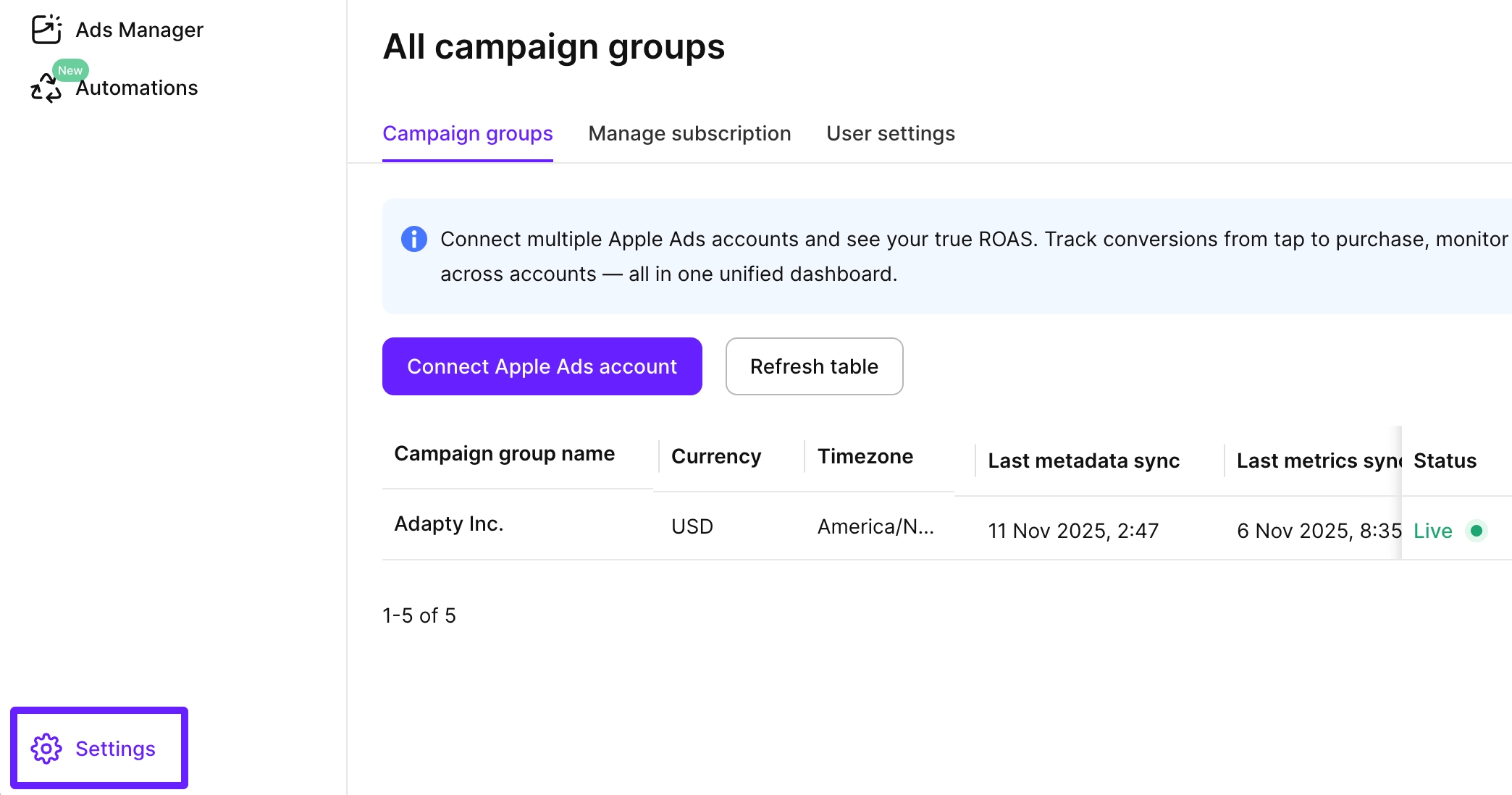 On the Campaign groups tab, you can see all Apple Ads accounts connected to Apple Ads Manager and add new ones. If you connect several Apple Ads accounts, all their analytics will be aggregated in a single Apple Ads Manager dashboard.
