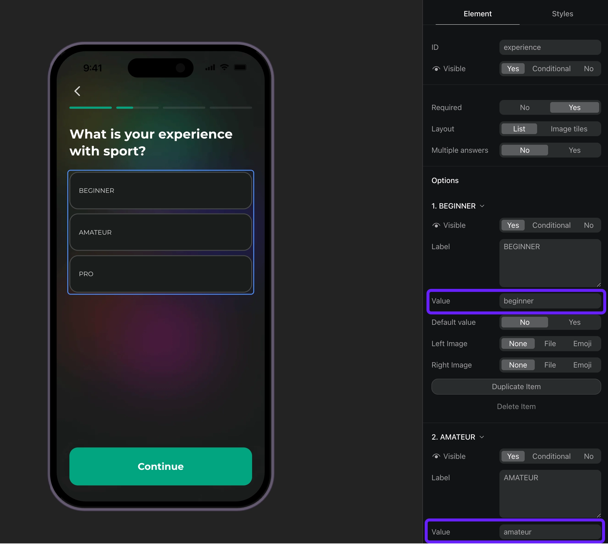 - Add a quiz in the onboarding builder and assign meaningful IDs to its options.