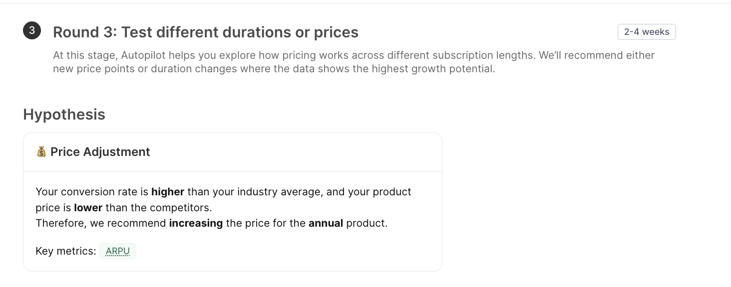 Your plan consists of three parts: setting new prices, updating paywalls, and conducting A/B tests with them. After each round, the winning strategy will advance to the next round. The winner of the final round will be your most efficient pricing option. Based on our estimates, completing the entire test cycle could increase your revenue by up to 80%.