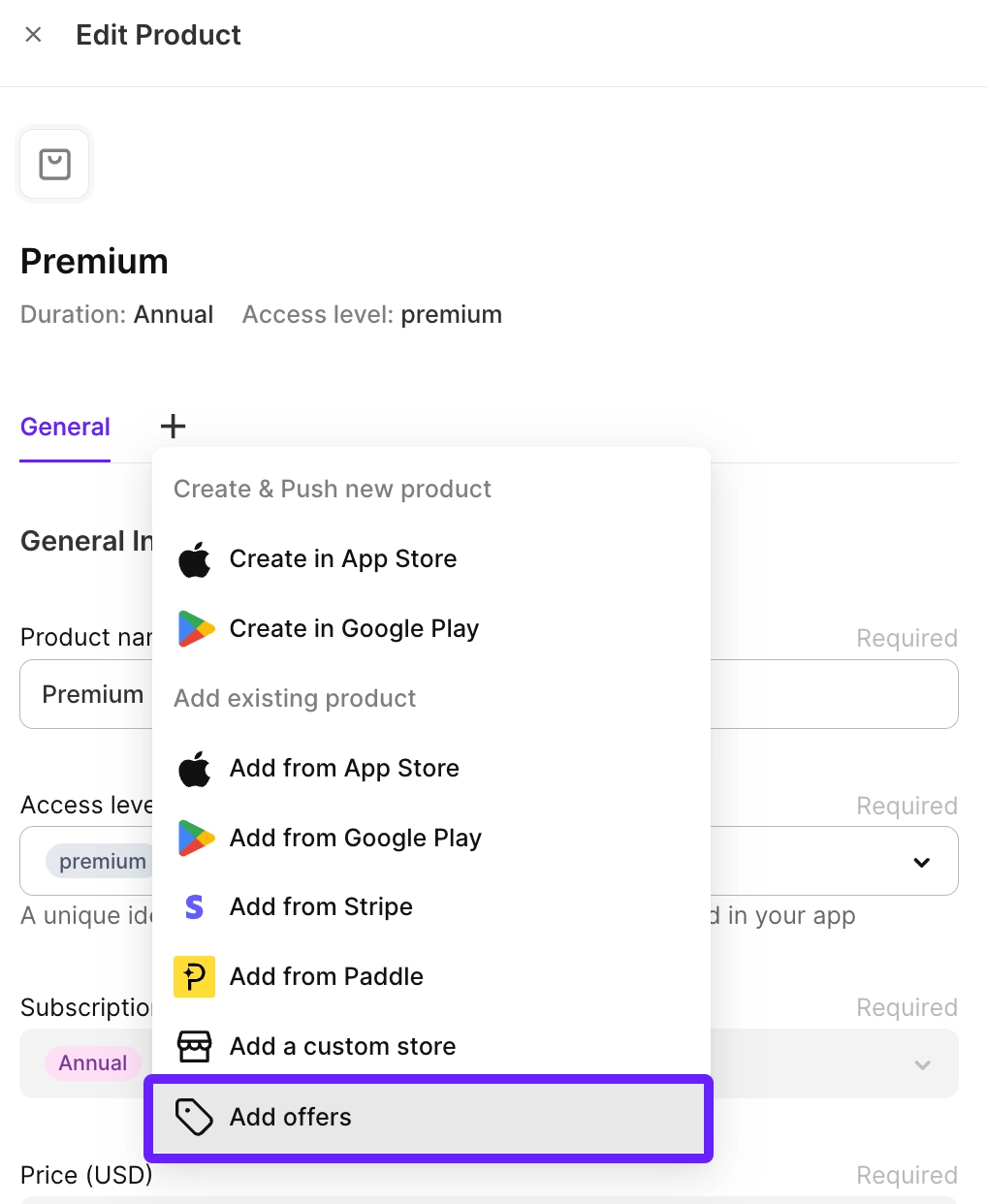 - When creating or editing a paywall, in the General tab, add a product to which you've just added the offer.