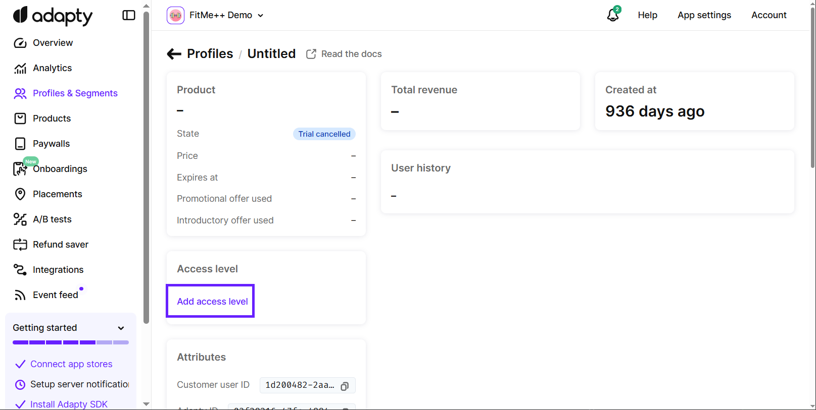 You also have the option to give a customer an access level from your server using the Adapty API. This comes in handy if you have bonuses for referrals or other events related to your products. Find additional details on the Grant access level with server-side API page.