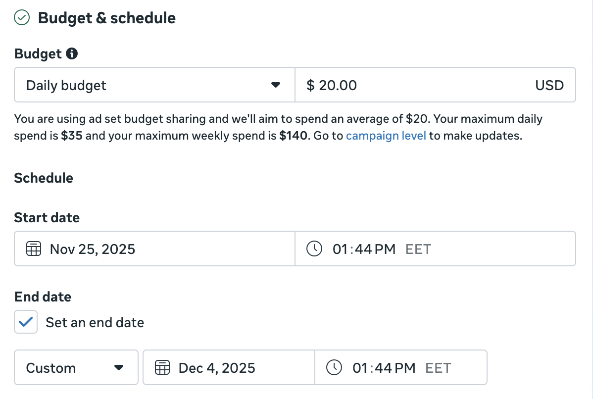 Set the start and, if applicable, end dates for the ad set. For example, if you want to advertise a promotional offer in your app, it is crucial to align the ad set timeframe with the offer.