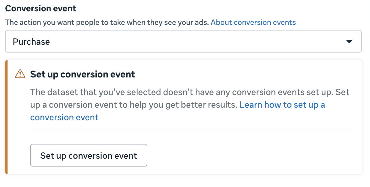 Select a Conversion event. In our case, it is probably going to be Purchase or Start trial. Don't worry if you see a warning that your dataset doesn't have any events yet – that just means that your dataset is new.