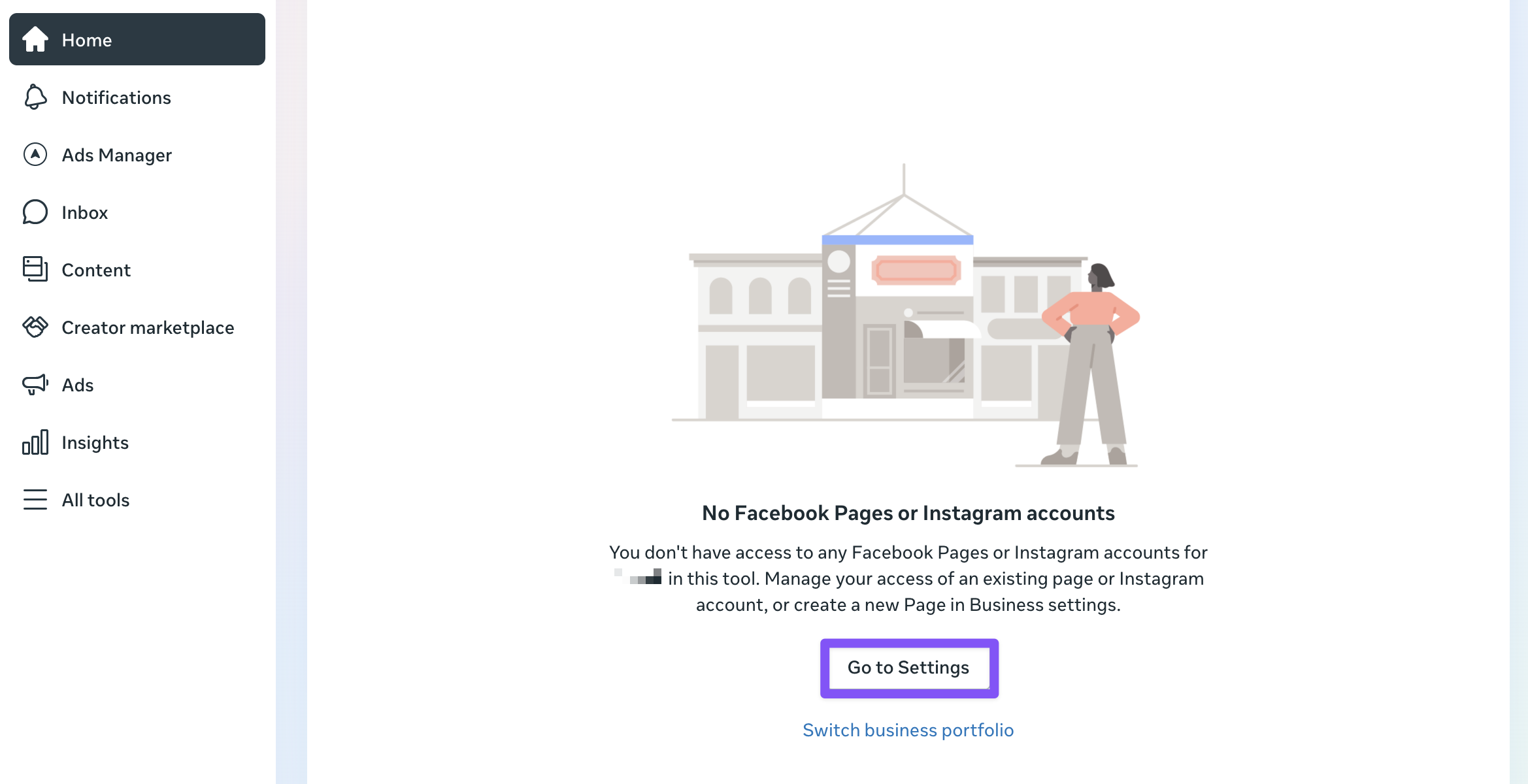 Go to business.facebook.com. If you don't have a business page in the business portfolio yet, you need to add it. Click Go to settings.