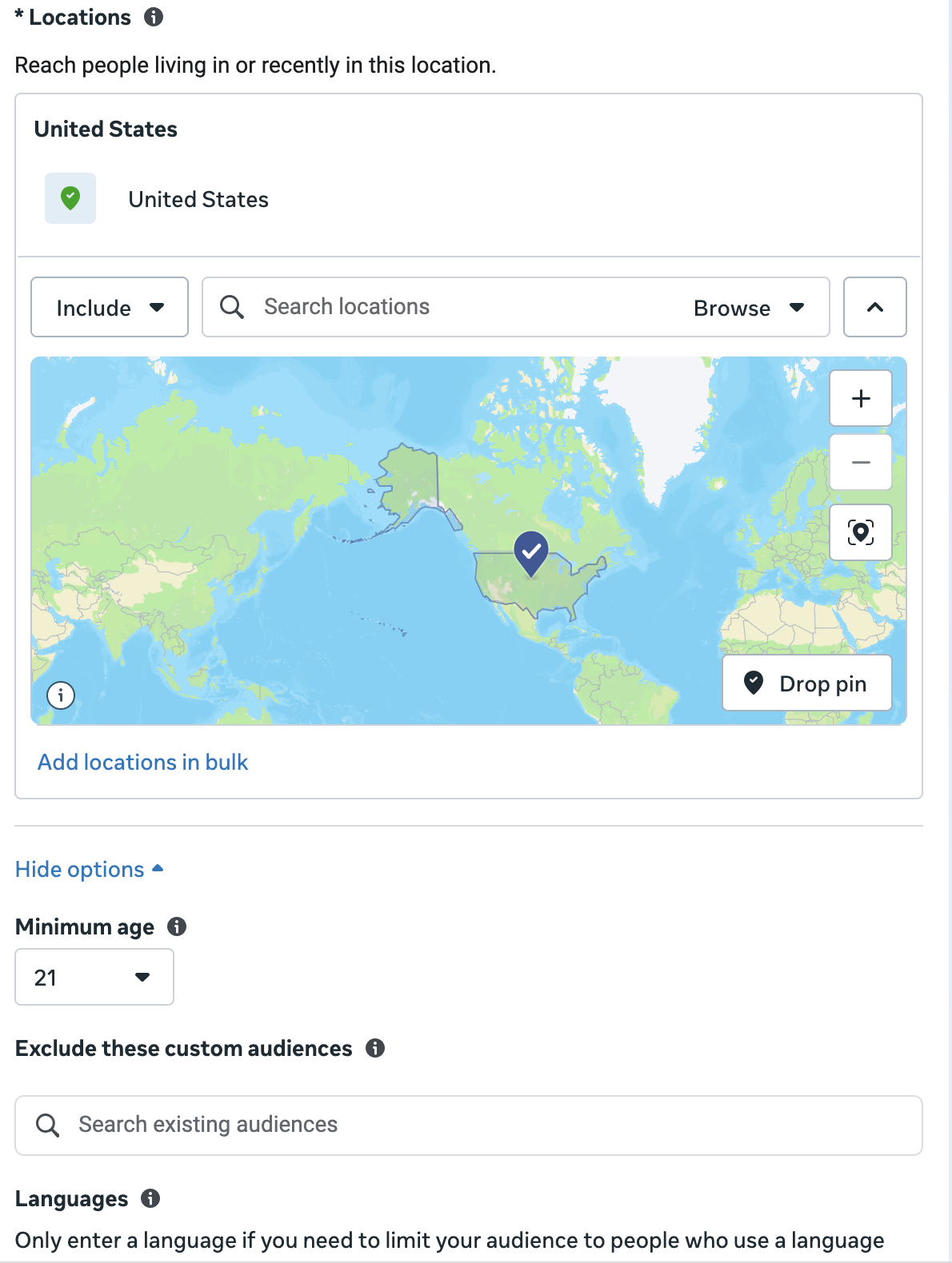 - Location: Locations can be as broad or narrow as you need them to be. You can limit Locations in the ad set to work with the region specifics in your ads.