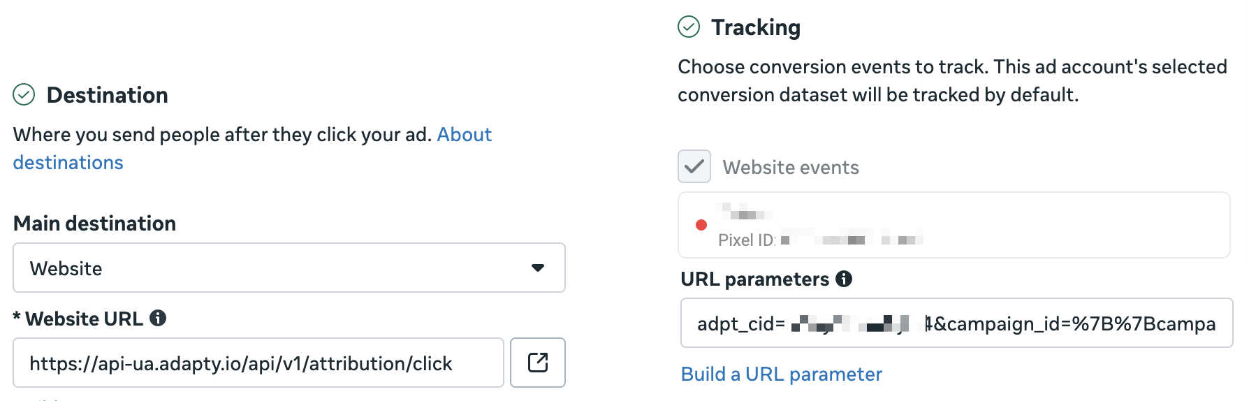 https://api-ua.adapty.io/api/v1/attribution/click. In Adapty User Acquisition, create a web campaign and paste the Click link content afterhttps://api-ua.adapty.io/api/v1/attribution/clickto the URL parameters field in the Tracking section.