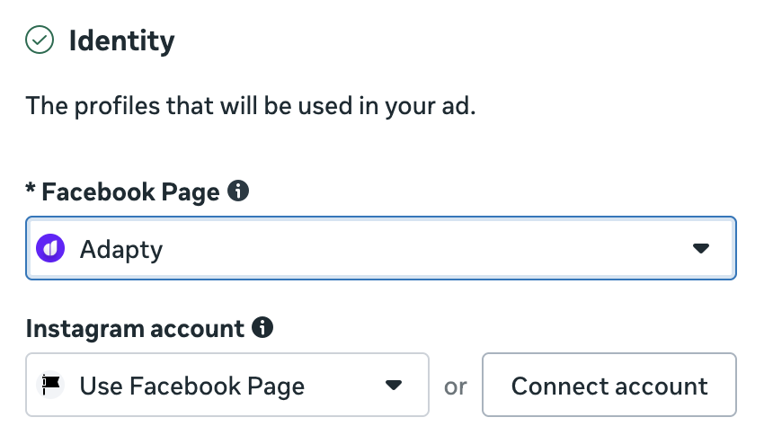 - In the Identity section, select the Facebook page that will be used for posting ads. If you have a separate Instagram account for your app and have connected it in Meta Business Suite at Step 1, select it in the Instagram account dropdown. Otherwise – select Use Facebook page, so Instagram ads are posted using the Facebook page.