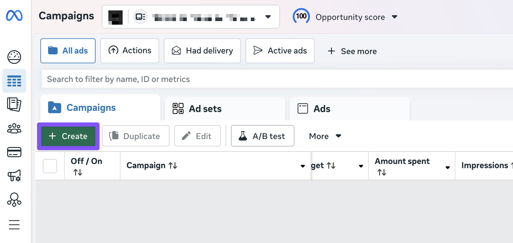 Go to Meta Ads Manager. On the Campaign tab, click Create.