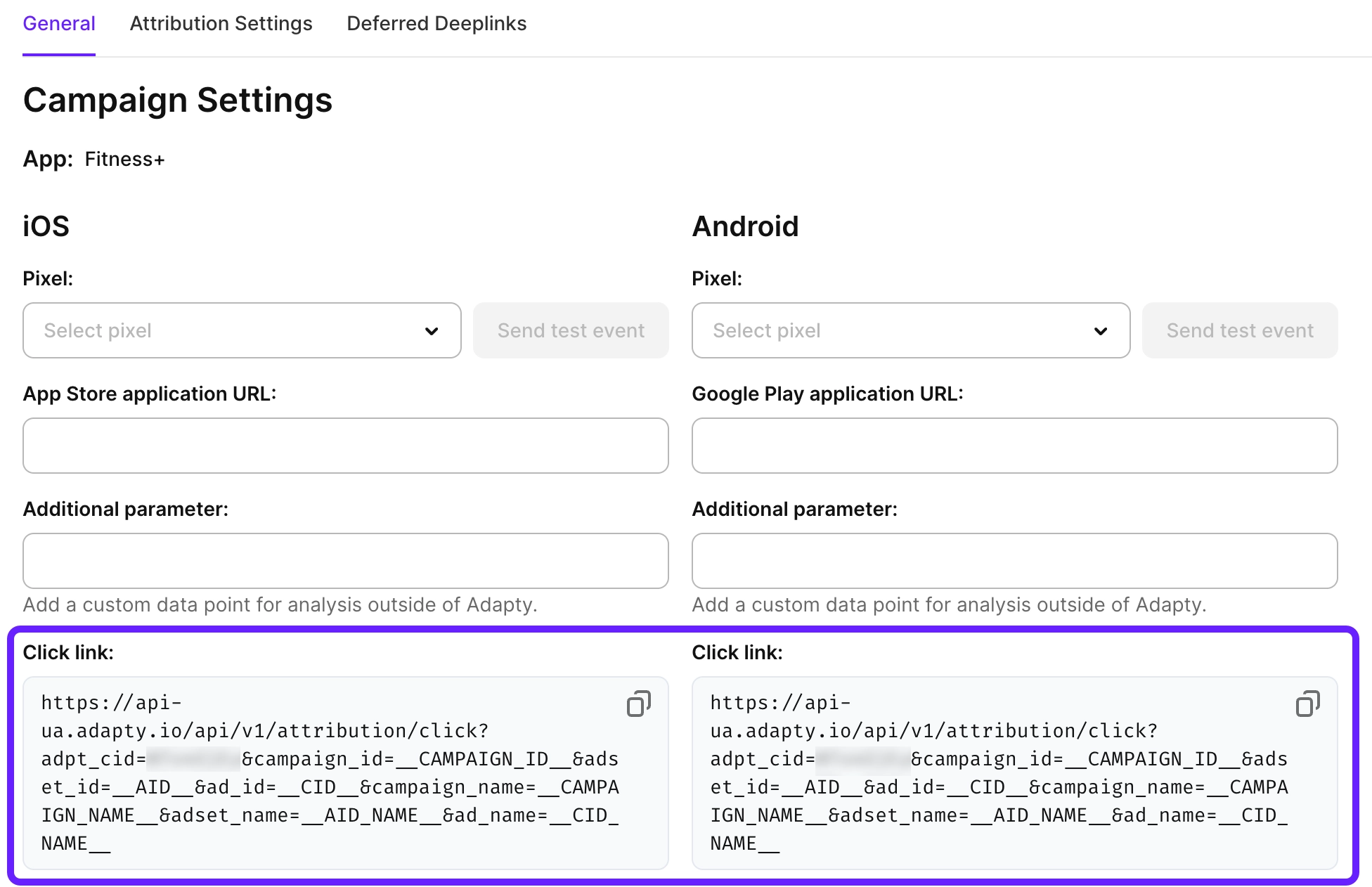 - Copy the Click link field value. Then, in TikTok Ads Manager, when creating your ad, paste this value in the Tracking URL field under the Advanced Settings section. This will allow Adapty to connect installs and purchases to ads in TikTok.